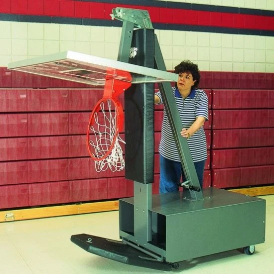 The Bison Club Court portable basketball hoop features a 48″ clear acryltic backboard and a 36″ safe play area. It has a spring assisted infinite goal height adjustment that ranges from 6-1/2′ to the official 10′ height. The 1-1/2″ thick, padded front riser provides additional padding and protection to those playing. For easy transportation and storage, the hoop has an easy flip down front pane and can fold down without the use of tools for movement through 78″ high double doors. The goal mounts directly to the extension arm, eliminating stress on the backboard during use. The Bison Club Court portable hoop features a fully enclosed oversized ballast enclosure to hold your ballast. After use, this hoop can easily be transported around the court without damaging the floor as it features non-marking casters. Bison is an official NFHS partner.
