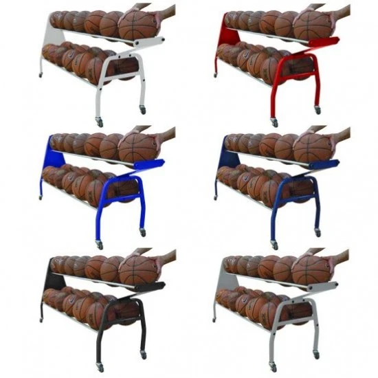 The Bison SharpShooter basketball cart is the perfect tool to not only store your basketballs, but also master your shot. This cart is built for rapid fire shooting practice as the top row features a gravity feed to one end allowing for maximum shots per minute. This durable, steel chrome plated ball cart can hold up to a total of 19 women’s or men’s basketballs. There are 4-floor friendly casters for easy transportation around the court. Optional lettering is available to customize your cart with your team name.