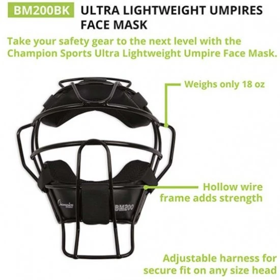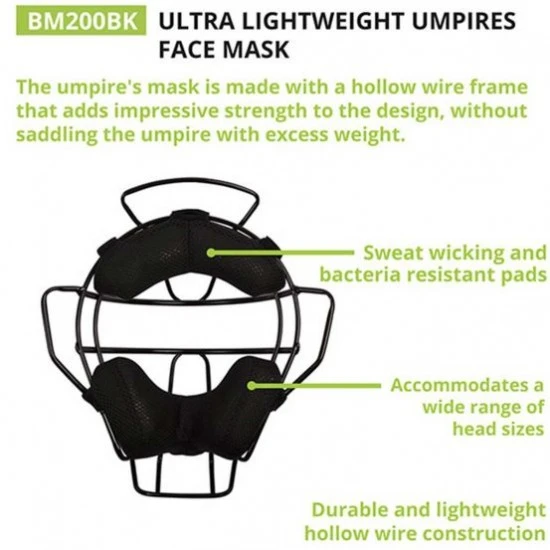 The Champion Ultra Lightweight umpire face mask is made from a hollow wire construction to give you the lightest mask on the market, weighing only 18 oz. This baseball umpire face mask has forehead, ear, and throat guard protection to keep you safe behind the plate. The umpire mask for sale has an adjustable harness and DryTek premium leather pads for efficient sweat-wicking.
