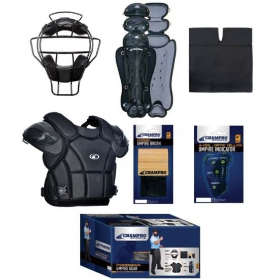 The Champro CBSUVK 6-piece umpire set is perfect for baseball and softball umpires that want to upgrade their gear. The set comes complete with a lightweight umpire face guard, a Pro-Plus umpire chest protector, a pair of low-profile Pro-Plus leg guards, a wooden umpire brush, a 4-dial indicator, and a professional umpire ball bag with inside pockets that can hold a brush, indicator and keys.