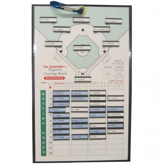 This magnetic coaching board keeps track of player’s positions, actions and statistics and makes it easy for coaches to change batting orders and fielding instantly and graphically. The opposite side is a whiteboard so you can diagram strategy.