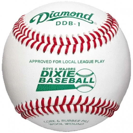 The Diamond DDB1 Dixie Boys & Majors competition grade baseball features a cork and rubber core, select wool blend winding, full-grain leather cover and Diamond seam.
