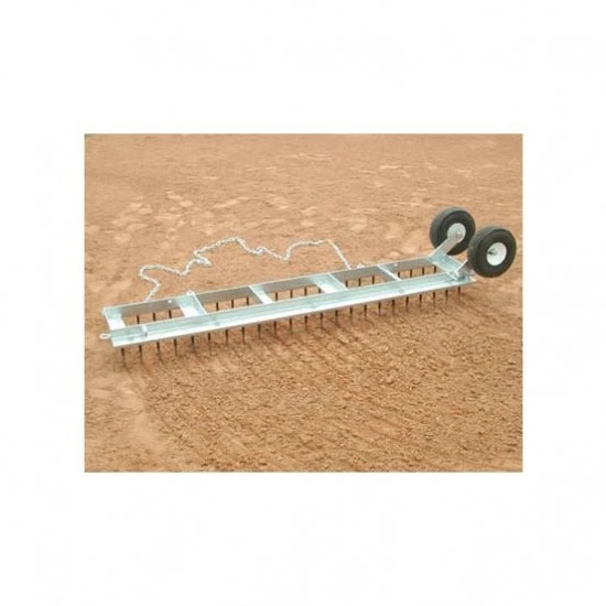 The Diamond Digger uses 4.5″ hard sharpened steel cutting teeth that can be replaced when worn. The pneumatic wheels allow you to roll for transport, instead of carrying it. This field groomer is features a hot dipped galvanized steel frame. A pull chain is provided on the front and there are hooks on the rear for easy attachment of any drag mat. The Diamond Digger is designed to hold up to 3 cement building blocks (not included) for additional weight when necessary. Remove the wheels to turn the groomer over and use it as a leveling sled. It is recommended that a tractor pull the Diamond Digger.