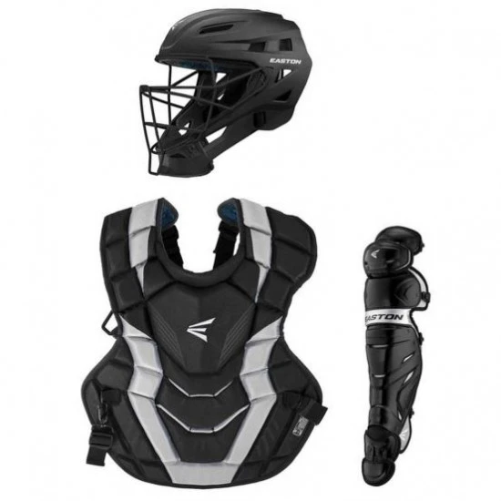 The Easton Elite X youth catcher’s gear box set includes an Elite X catcher’s helmet, chest protector, and leg guards. The Elite X youth catcher helmet fits hat sizes 6-1/2 – 7-1/8, and features a black steel cage designed with a flat middle bar for increased visibility, a durable ABS plastic shell with strategic airflow vents, plush wrapped padding with breathable air mesh and BioDri moisture wicking fabric on forehead, and meets the NOCSAE standard for all levels of play. The Elite X youth chest protector measures 15″ and features stacked memory foam in the abdominal area that provides improved rebound control, a 4-point webbing strap system with neoprene back organizer for a tight fit, an adjustable shoulder cap, a heavy-duty black coated steel inset waist clip for a better wrapped fit, and meets the NOCSAE Commotio Cordis chest protector standard. The Elite X youth triple knee leg guards measure 14″ and feature a reinforced knee and thigh connection that improves fit and security when moving in and out of the squat, a wide-set knee design that provides a larger surface area in the blocking position and explosive side to side movements, removable inner knee and shin pads for adjusted fit and comfort, and a vented shell design for increased air flow and breathability.