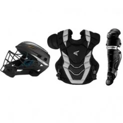 The Easton Pro X baseball catcher’s box set includes a Pro X catcher’s helmet, chest protector, and leg guards. This catcher’s helmet fits an adult hat size of 7-1/8 – 7-1/2 while the small helmet fits a hat size of 6-1/2 – 7-1/8. This helmet features a black steel cage with a flat middle bar for increased visibility, an ABS plastic shell with strategic air flow vents, plush wrapped padding with breathable air mesh and BioDri moisture wicking fabric liner that will keep you cool behind the plate on gameday. The ergonomic chin cup design allows for better fit and communication with your pitcher. The Easton helmet meets the NOCSAE standard for catcher’s helmets. The Easton chest protector measures 17″ for adults (age 15+) and 16″ for intermediate players (age 13-15). It features a double layer chest design with EVAIR foam bottom layer and memory foam abs to give you the best rebound control and breathability of its class. The patent-pending silicone grip abs give you reduced spin on blocked balls. This protector also comes with an adjustable shoulder cap, a 4-point webbing strap system with neoprene back organizer for a tight fit, heavy-duty black coated steel inset waist clips on both sides for a secure wrapped fit and adjustability, and meets NOCSAE Commotio Cordis chest protector standard. The Easton leg guards measure 16.5″ for adults (age 15+) and 15.5″ for intermediate players (age 13-15). The guards feature a reinforced knee and thigh connection that improves fit and security when moving in and out of the squat. The wide-set knee design provides a larger surface area in the blocking position while the EVA foam layer adds extra comfort to the knee area and the Poron XRD removable inner knee cap padding adds top notch comfort and support. It also features a vented shell design for air flow and breathability and EVAIR foam liner for inceased breathability.