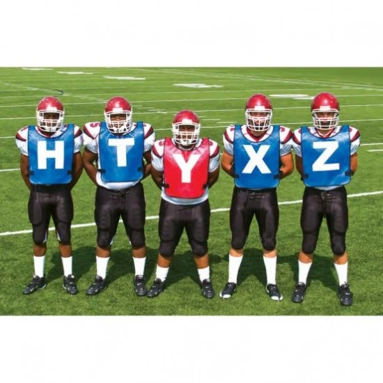 Fisher football scout vests help players and coaches identify key players and is a must-have for coaches in the film room! This set includes 4 blue vests with white letters (H, T, X and Z) and 1 red vest with a white letter “Y”.