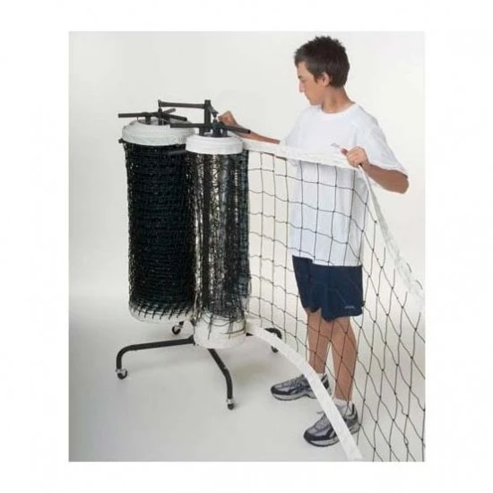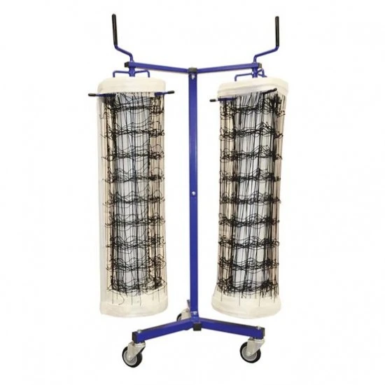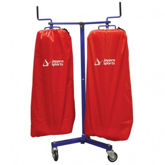 The Jaypro VNK22 double volleyball net storage cart easily stores any size volleyball nets in minimal space. The 4″ non-marking swivel wheels are safe for gym floors. This cart ensures the net headband is wound clean and tangle free. The sturdy frame is constructed of 1/2″ thick-walled square steel tube construction. Two storage bags are included.