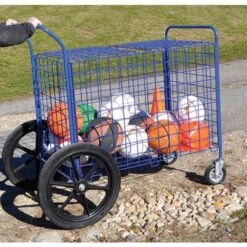 The Jaypro Totemaster field cart is an all purpose carrier that provides a large holding capacity for all types of equipment. 20″ semi-pneumatic rear oversized all terrain wheels are tough, durable and never go flat. The 6″ semi-pneumatic front swivel casters come with turf tread and provide a 10″ ground clearance for maneuvering over all terrain. This equipment cart features 3/16″ all-welded steel powder coated wire with 3″ square mesh and a hinged cover that can be locked for secure storage.