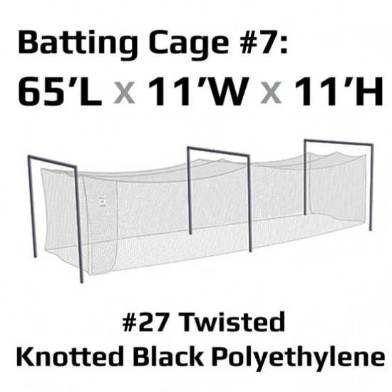 The Jugs baseball backyard batting tunnel net package allows you to have batting practice and perfect your swing in the comfort of your own backyard. This package includes an outdoor batting cage frame and polyethylene net measuring 65’L x 11’W x 11’H, a standard L-shaped protective screen to keep the pitcher safe, and a hanging backdrop to replicate the strike zone. The included twisted knotted black polyethylene netting is easily hung on the cage frame and is designed specifically for baseball and softball use. Knotted nets have a higher overall strength and durability rating making them superior for direct impact sports like baseball and softball. Twisted netting has a higher abrasion resistance than braided, because twisted has less surface area than braided. The polyethylene netting doesn’t absorb water, making it perfect for wet or humid hot climates. No permanent construction is required for the batting cage frame. The cage quickly dismantles simply unhooking the turnbuckles to lower entire cage to the ground.