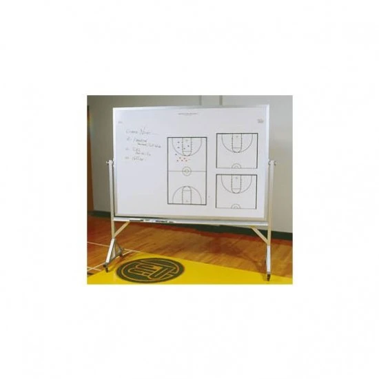The KBA Roll-A-Way basketball playmaker is a multi court, full sized coaching board that features a front side with one full court, two half courts and additional space for coach’s assignments, game strategy and instruction. The reverse side has a large porcelain steel dry erase markerboard surface.The board has a heavy-duty aluminum frame that revolves and a positive locking mechanism to hold the board in place while in use. 2-1/2″ casters allow for easy movement on any hard surface. The board includes 4 dry erase pens, dry eraser and magnetic pieces with vinyl numbering system.