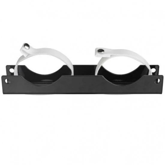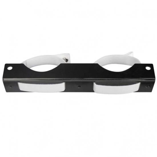 The Porter volleyball standards storage rack provides a convenient method for storing two volleyball standards in a compact space. Each upright is held in place with a hook-and-loop Velcro® closure. This unit ships complete with wall installation hardware.