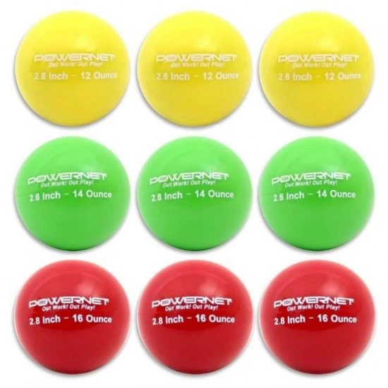 These weighted training baseballs come in a set of (9) and all measure 2.8″ with progressive weights. Bring your training to the next level and improve power and contact rate with this system from POWERNET. You can work hitting or throwing reps with the lightest ball, then step up to the next weight as your swing gains speed and power through the ball. Finish with the heaviest ball for maximum gains! The set comes with (3) each of the 12, 14 and 16 oz weights.