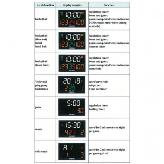 The Seiko table-top scoreboard scores multiple sports including basketball, volleyball, tennis and more! It can also be used as a stopwatch, countdown timer, or pacer and can be operated from it’s backside control panel or the wireless remote which is included.
