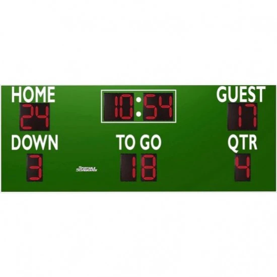 The 7416 Football Scoreboard by Varsity measures 16′ W x 6′ H x 8″ D and features super-bright 15” high digital LED numerals that are 100,000 hour-rated and are visible from over 300 feet away. The scoreboard’s 22-gauge galvanneal steel cabinet features a powder-coat finish that provides durability and will keep this scoreboard looking brand new for years! The 7416 scoreboard package includes a wireless remote control, digit protective shields, a junction box cover (cable models only), mounting rails and a CD that contains complete operation/installation/service manuals, and 5-year limited warranty details.