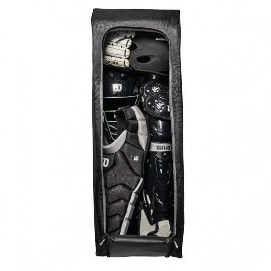 Get your gear to the game with ease in the Wilson team gear bag on wheels. Measuring 39.5″L x 14″W x 15″H, this large gear bag is designed to fit multiple helmets, bats and catcher’s gear, making it the perfect for your team to take on the road. This wheeled equipment bag features a rigid construction with support rails and an interior support bracket for added strength. This is the one bag for everything you’ll need to bring home a win.